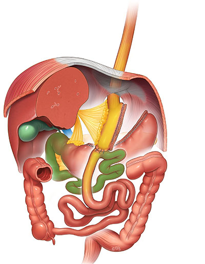 The small bowelis run to 200 cm distal to Treitz’ ligament and the nan astomosedantecolic end-to-side to the gastric pouch.